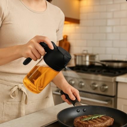 Answer 2: The dual-function design allows you to switch seamlessly between a fine mist spray for even coverage and a controlled pour for precise amounts. This helps prevent mess and ensures that you can use just the right quantity of oil for your cooking needs.